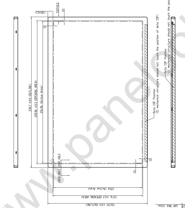 | 驱屏电压 | 3.3/10.0/18.9/-7.8V (VCC/AVDD/AVDD/VGL) | 显示区域 | 216.96*135.6 mm |