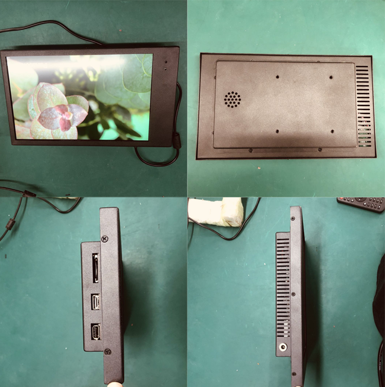 显示器是不带触摸的,外壳是8mm以上的钣金外壳,不防水,用于嵌入开放式显示设备中,也可单独用于半户外,插SD卡,带遥控,有外放喇叭,有一套随拆壁挂支架,hdmi输入,带一个usb接口